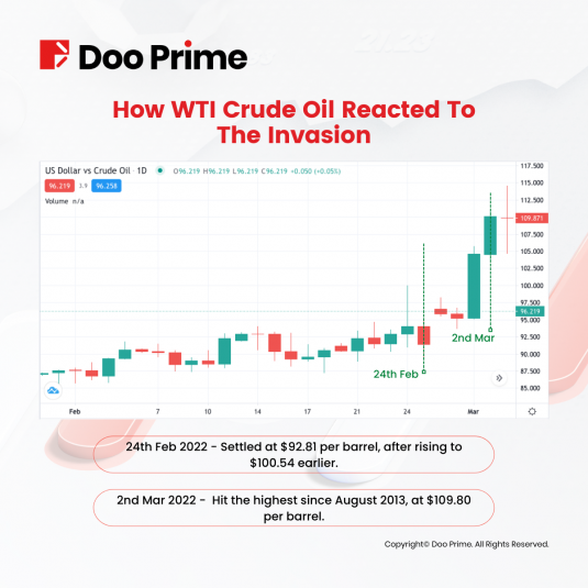 On 2nd March 2022, oil spikes as supply disruptions mounted following sanctions on Russian banks, and traders scrambled to seek alternative oil sources in an already tight market.