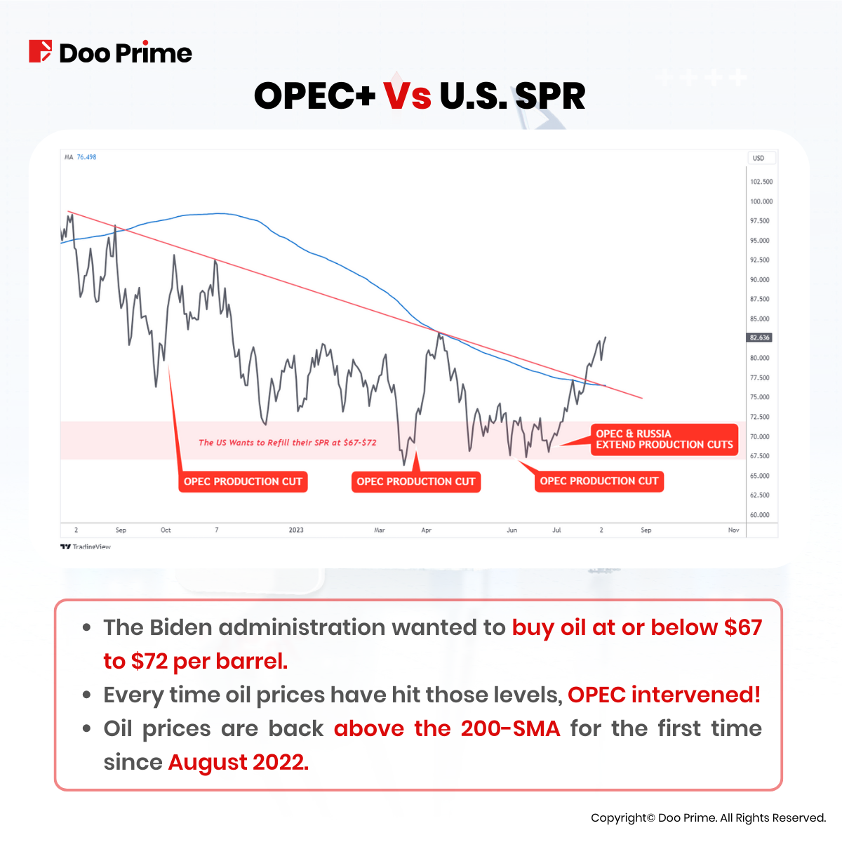 The Strategic Petroleum Reserves are being depleted day by day. Higher oil prices have been a major contributor to inflation which the Federal Reserve and U.S. government have been fighting for 2 years now. If OPEC+ and Russia continue to reduce oil production, it will push inventories lower and demand will likely increase, which could send oil prices much higher towards USD 90-100 by the end of this year.