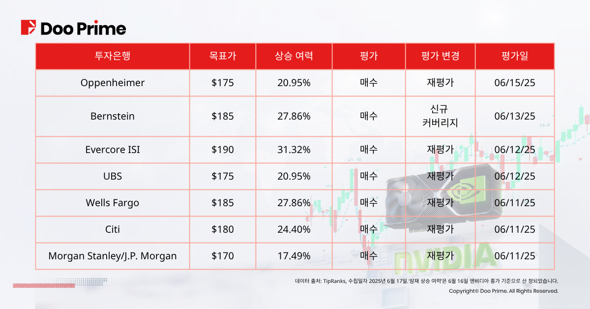 한편 모건스탠리 외에도 6월 들어 다수의 월가 주요 투자은행들이 엔비디아에 대한 투자의견 및 목표주가를 상향하거나 긍정적으로 유지하며 낙관적인 전망을 이어가고 있습니다.