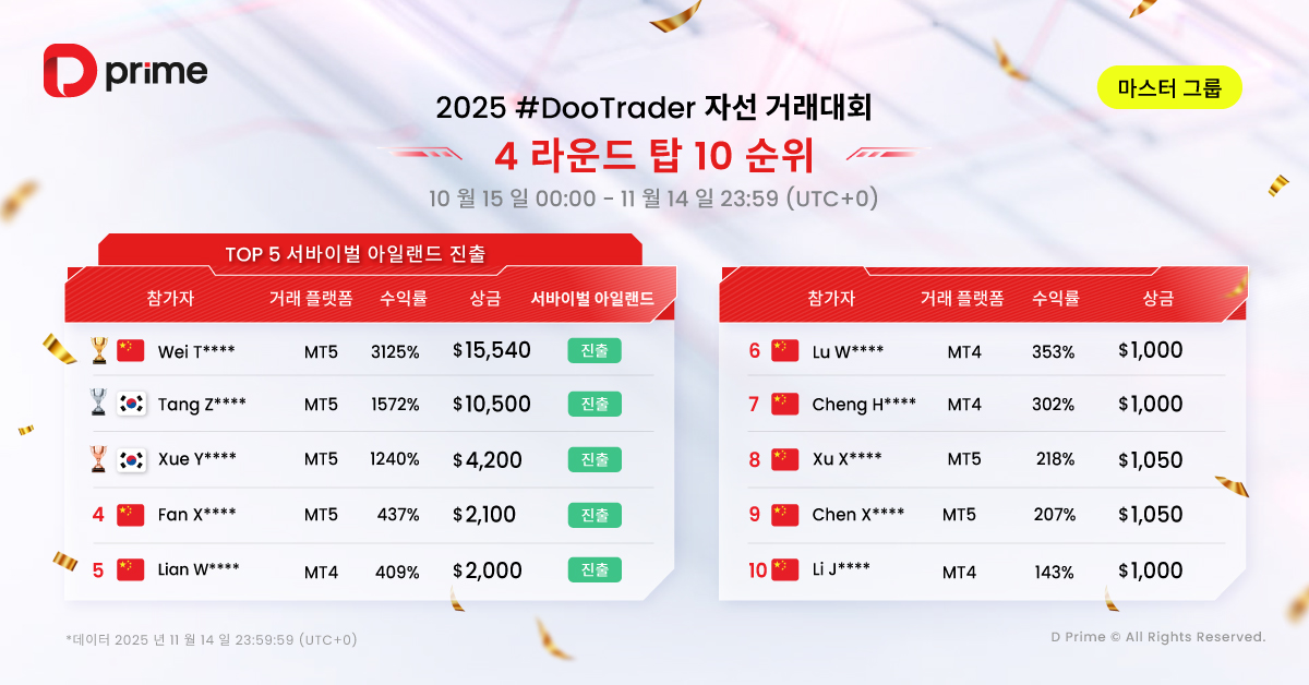 두 그룹의 참가자들은 4라운드 월간 대회에서도 높은 강도의 경쟁을 이어갔습니다. 이번 대회에서도 D Prime의 주요 인기 종목인 XAU/USD, GBP/JPY, USD/JPY, EUR/USD 등이 핵심 트레이딩 종목으로 주목받았습니다.