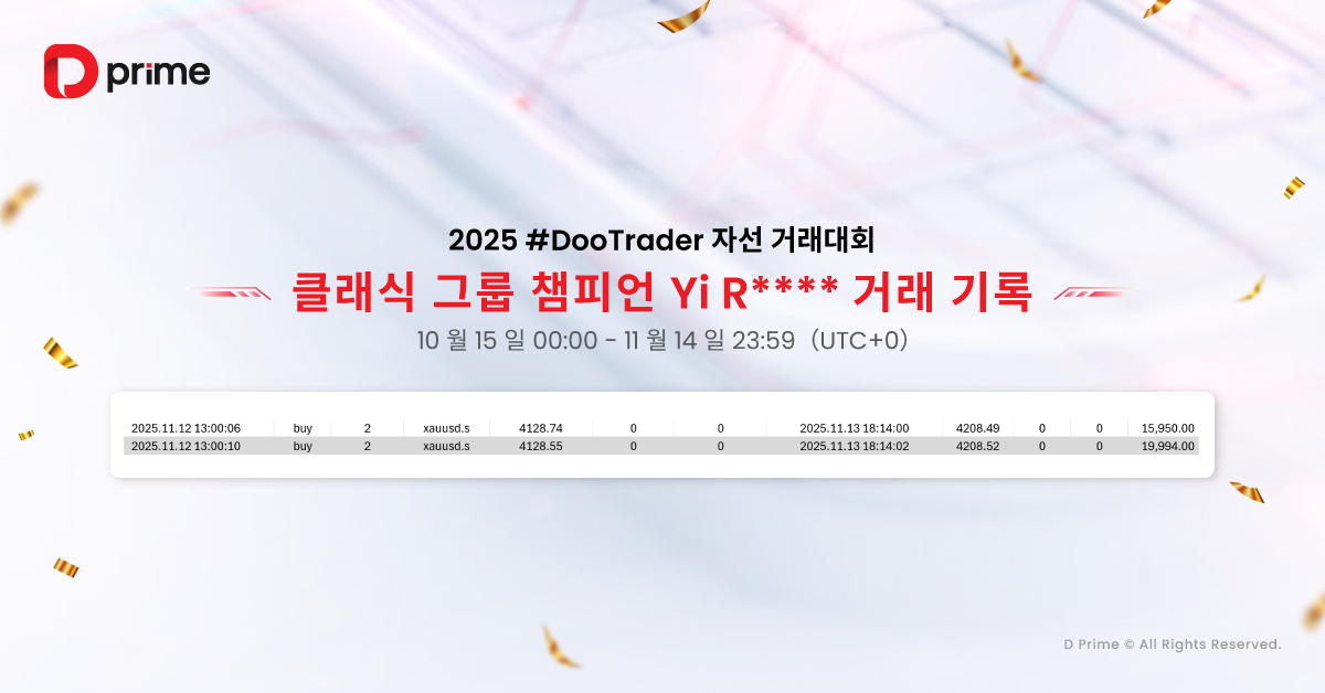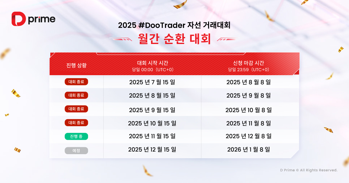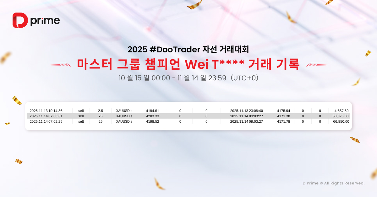 주목할 점은 2025 #DooTrader 자선 트레이딩 대회가 단순한 경쟁이 아니라는 것입니다. 참가자가 대회에서 1랏 거래를 완료할 때마다, D Prime은 참가자를 대신해 0.1달러를 기부하여 빈곤 아동들의 교육 환경 개선을 지원합니다. 즉, 여러분의 모든 거래가 더 많은 아이들의 미래를 밝히는 데 기여하게 됩니다.