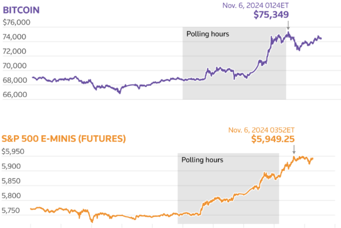 As ações alinhadas com a agenda de Trump, como Trump Media & Technology Group, subiram quase 6%, enquanto as ações da Tesla aumentaram 14,75% com o apoio público de Elon Musk à campanha de Trump. Os ganhos também foram notáveis entre empresas de criptomoedas, companhias de energia e operadores de prisões privadas, enquanto as ações de energia renovável ficaram para trás.