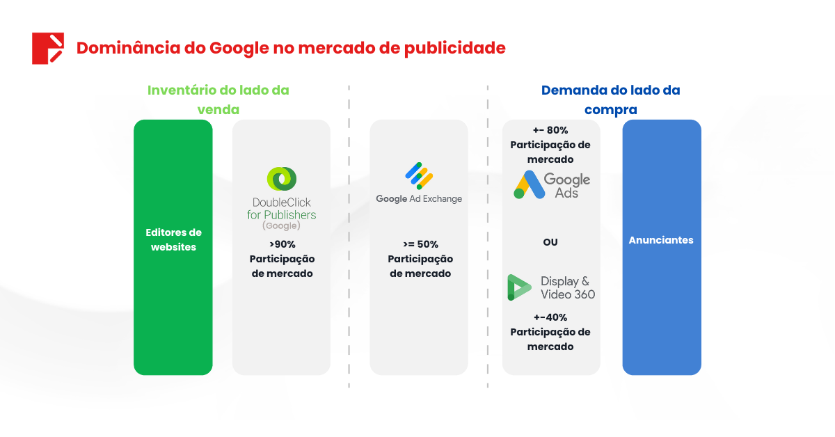 Em 9 de setembro, o DOJ intensificou seus esforços ao lançar uma segunda investigação contra o Google, acusando-o de tentar monopolizar o setor de publicidade online. O Google domina este mercado ao cobrar taxas de editores por colocações de anúncios e de anunciantes que executam campanhas por meio do Google Ads ou Display & Video 360. Veja a imagem abaixo.