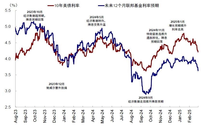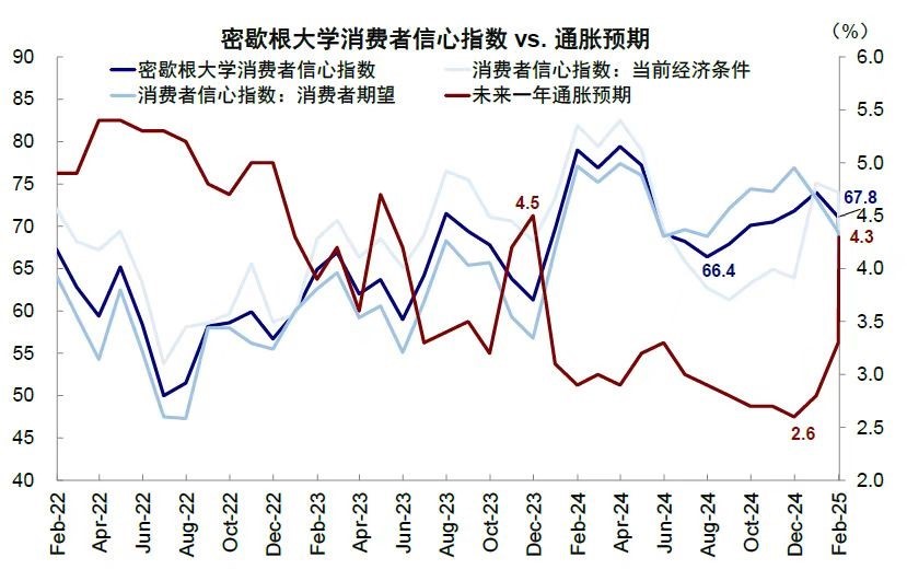 因此,近期我们看到的数据走弱都是去年 9 月以来利率不断走高的结果,而 1 月以来美债利率再度下行,对经济的提振效果将大概率也会在未来一段时间得到体现,未来最大的变数在于特朗普的关税风险,即外部风险对内部市场的冲击影响几何?这也是上周鲍威尔讲话时传递的背后根本逻辑原因。