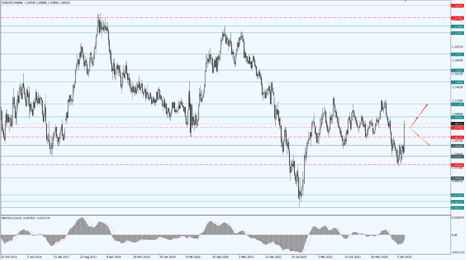 • 如果欧元兑美元承压回落至 1.0778 一线下方,则依次关注 1.0632 和 1.0500 两个位置的支撑力度。