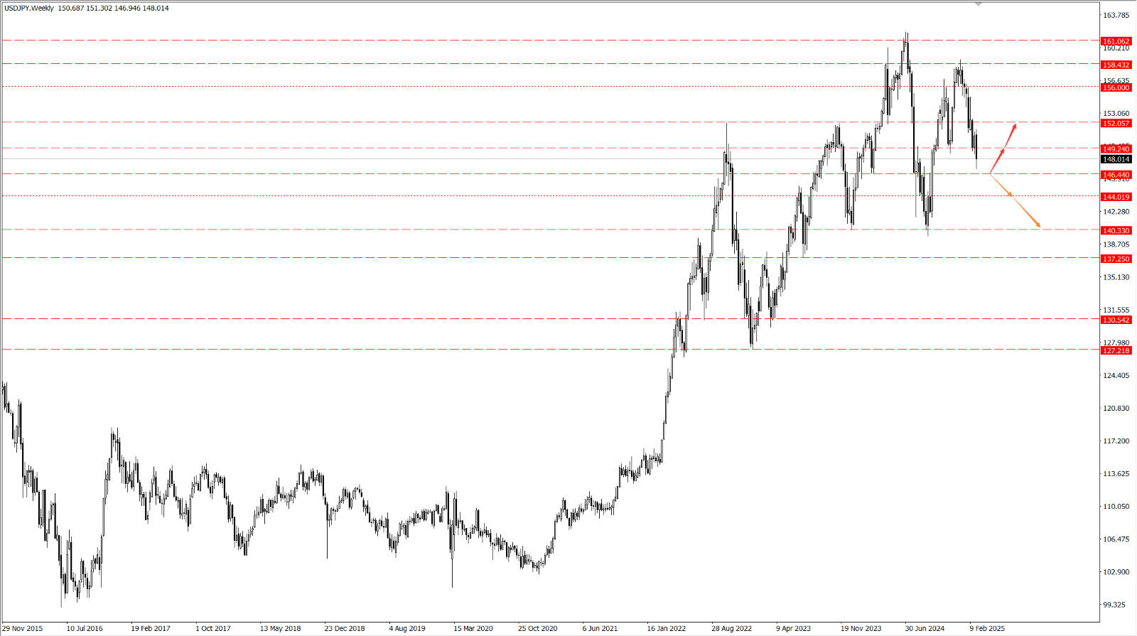 • 如果美元兑日元在 146.44 一线附近企稳回弹,则关注后市美元兑日元的反弹力度,届时依次关注 149.24 和 152.05 两个位置的压制力度;