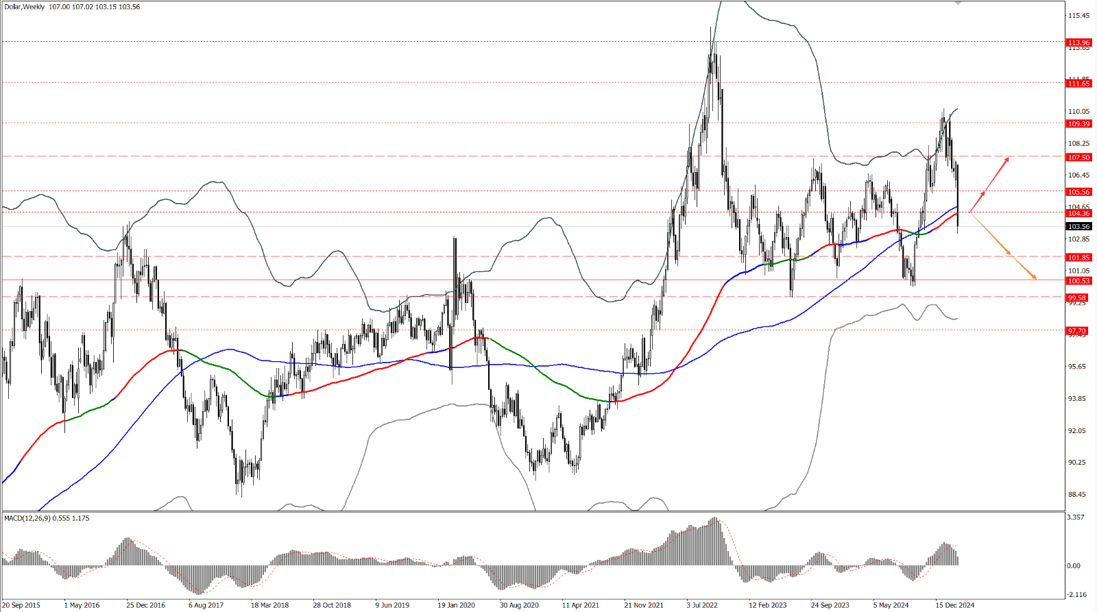 • 上周,美指在周多空分届 107.50 一线下方承压大幅回落,形成力度阴 K,整体空方势能强劲;