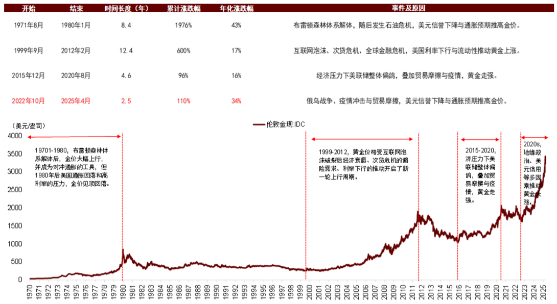 本轮黄金牛市周期从 2022 年底启动,黄金价格从 1600 美元/盎司涨至 3300 美元/盎司,价格在两年半的时间上涨 1 倍。考虑到当前全球经济面临百年变局(参见文章),经济结构巨变可能不亚于 70 年代与 21 世纪初。从历史上黄金牛市行情的幅度与时长相比,当前黄金行情结构的演化仍不充分,甚至有可能只是出于初期阶段。