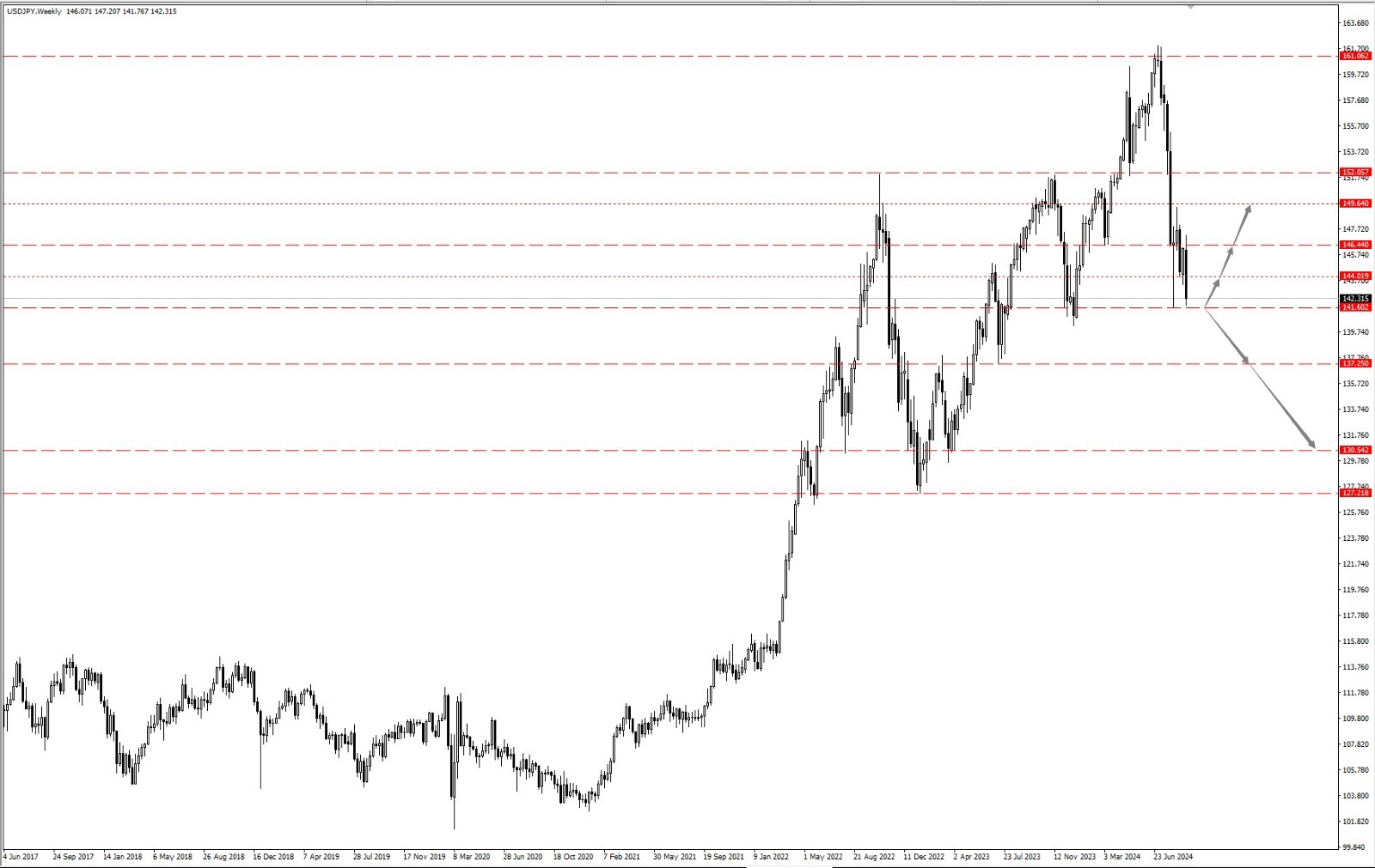 - 上周日元的强势主要得益于避险需求的推动以及市场对日本央行即将调整货币政策的预期,从而致使美日在 146.44 一线承压后大幅回落,并跌至关键位置 141.60 一线附近;