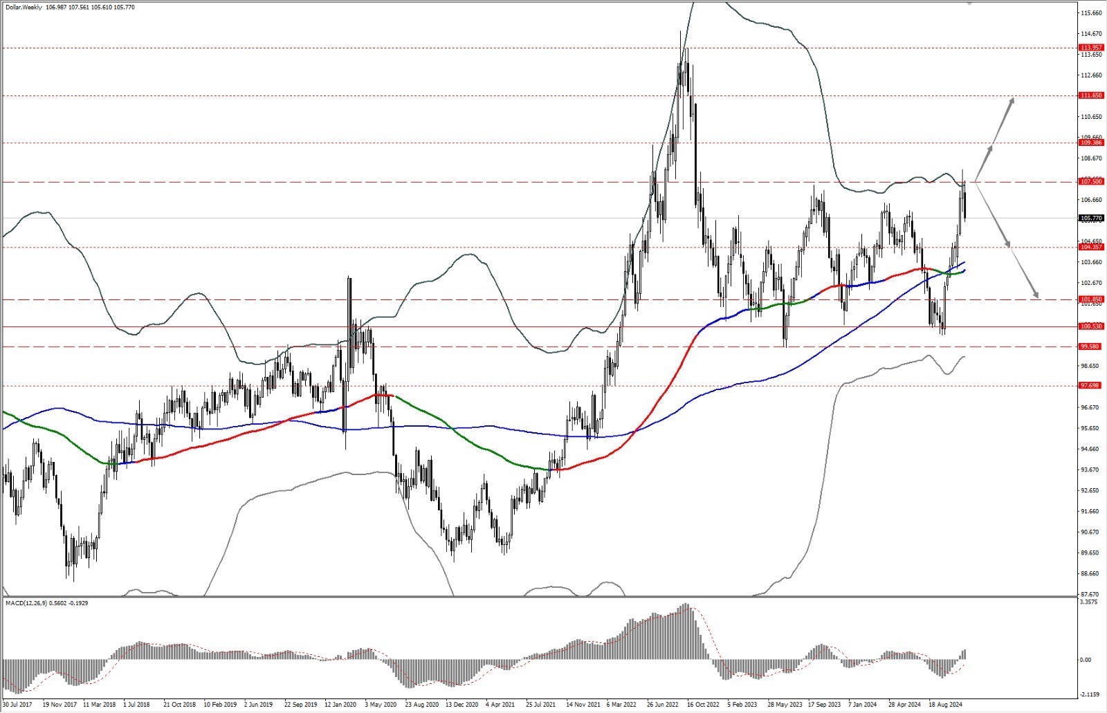 - 如果美指企稳回弹并力度上破 107.50 一线,则依次关注 109.38 和 111.65 两个位置的压制力度。