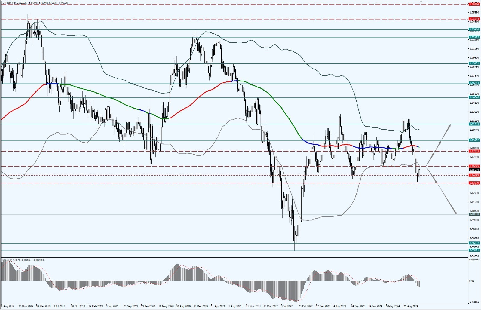 • 上周欧元在底部 1.0397 到 1.0607 区间横盘震荡,多方积极抵抗,但整体依旧处于空方主控区;
