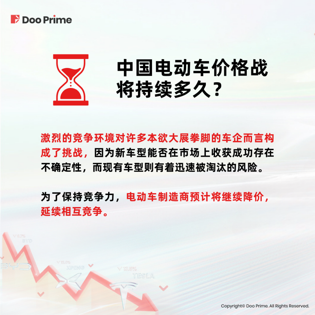 由于这场价格战尚未出现任何减退迹象,因此何时结束仍不确定。这种竞争环境对许多本欲大展拳脚的车企而言构成了挑战,因为新车型能否在市场上收获成功存在不确定性,而现有车型则有着迅速被淘汰的风险。为了保持竞争力,电动车制造商预计将继续降价,延续相互竞争。