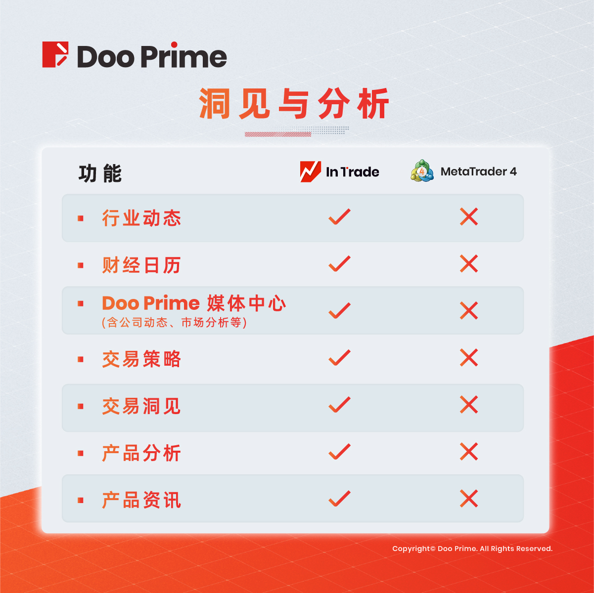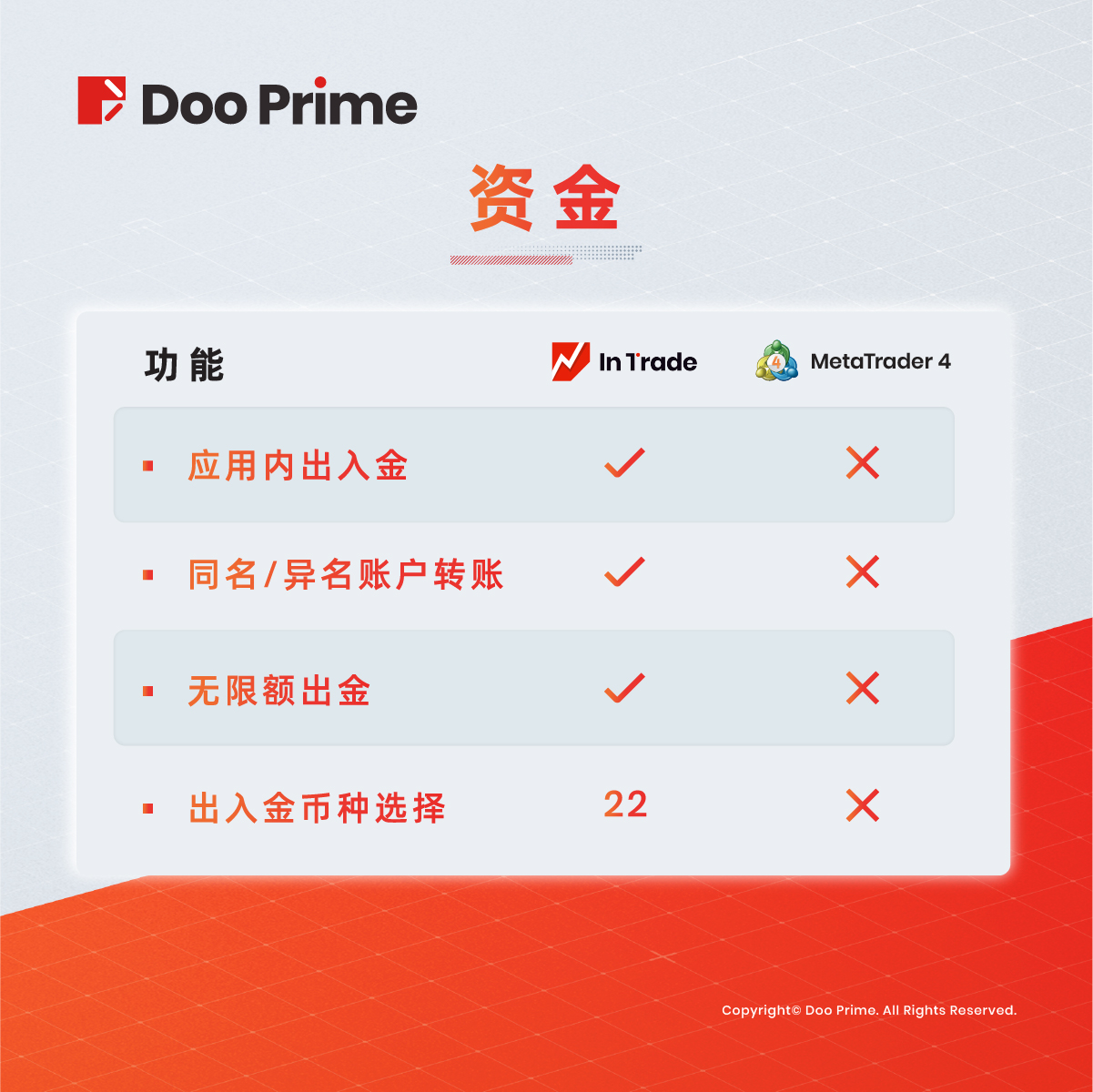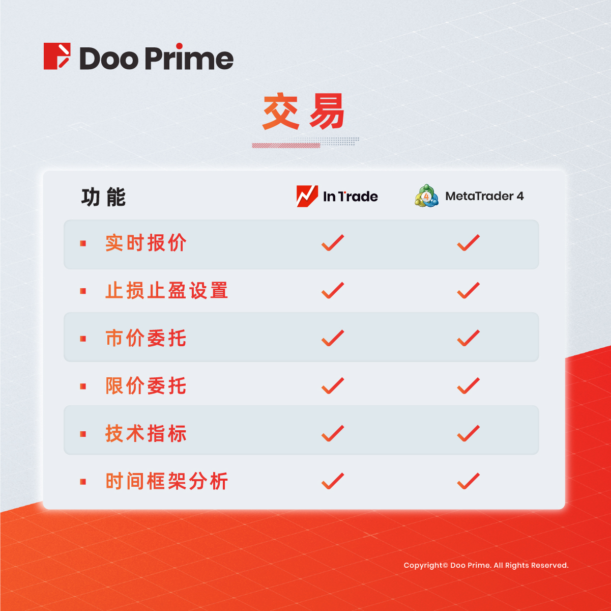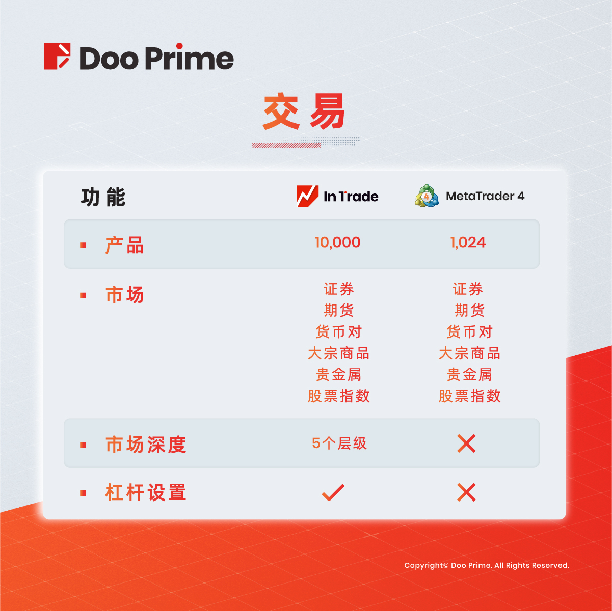 Doo Prime InTrade 和 MT4 的应用程序均可满足投资者的基本交易需求,选择使用哪个平台取决于投资者的个人需求。