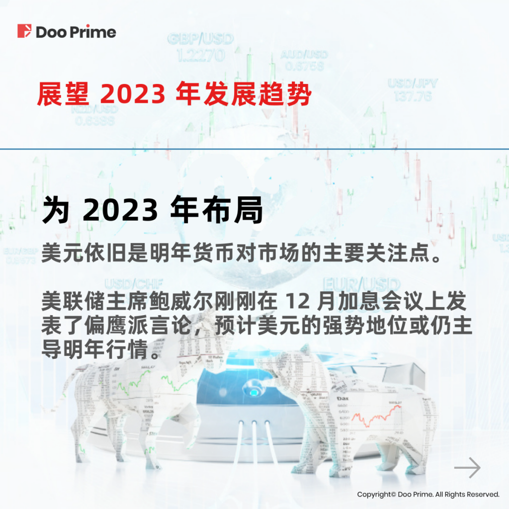但总而言之,美元依旧是明年货币对市场的主要关注点。考虑到在刚刚结束的 12 月美联储加息会议上,美联储主席鲍威尔发表了偏鹰派言论,预计美元的强势地位或仍主导明年行情。