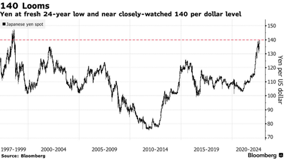日本上一次干预汇市支撑日元是在 1998 年亚洲金融危机期间,当时美元兑日元飙升至 146 左右。