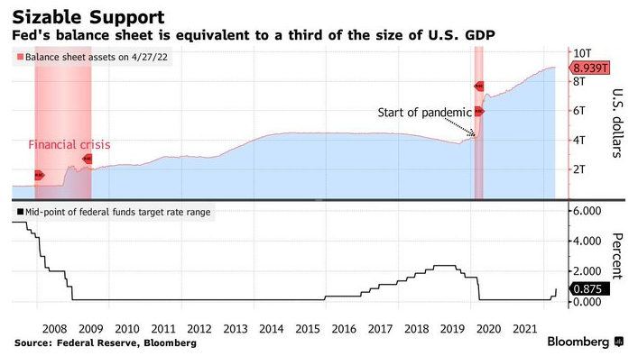 美联储宣布 6 月 1 日开始以每月 475 亿美元(其中 300 亿美元国债, 175 亿美元 MBS)的步伐缩表,将在三个月内逐步提高缩表上限至每月 950 亿美元(其中 600 亿美元国债,350 亿美元 MBS)。