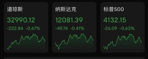 截至收盘,道指跌幅为 0.67%,报 32990.12 点;纳指跌幅为 0.41%, 报 12081.39 点;标普 500 指数跌幅为 0.63%,报 4132.15 点。