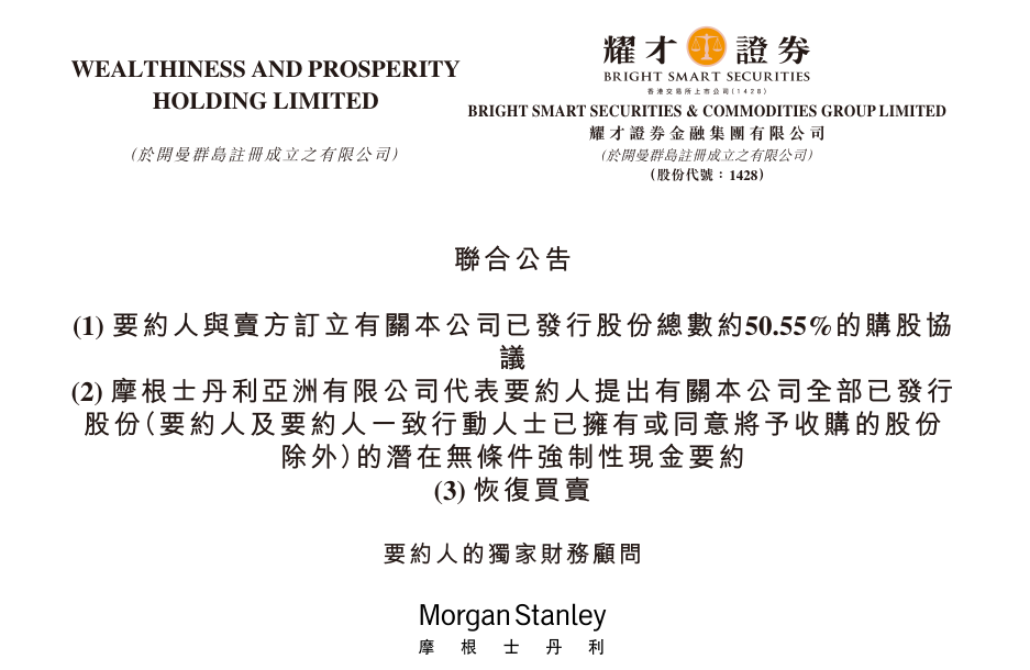 耀才证券同时向其他股东发出现金收购要约,收购价为每股 3.28 港元,相比耀才证券 4月 23 日停牌前的最新价高出 7.54%。