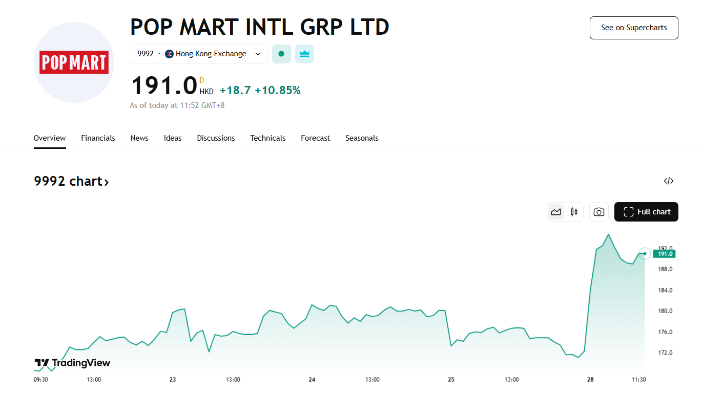 4 月 28 日,泡泡玛特(HK:9992)盘中暴升 12%,股价最高触及 194.3 港元,创历史新高!今年迄今,泡泡玛特已累涨 112.6%;在 2024 年全年泡泡玛特股价大升 346.66%。