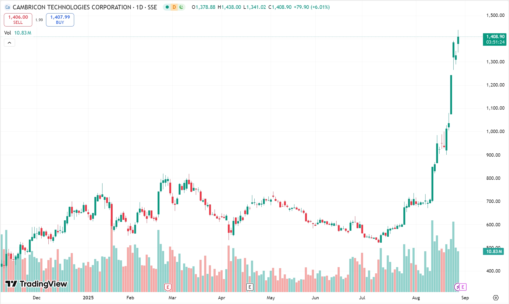 寒武纪业绩爆发,上半年营收飙升 43 倍!股价突破 1400 元