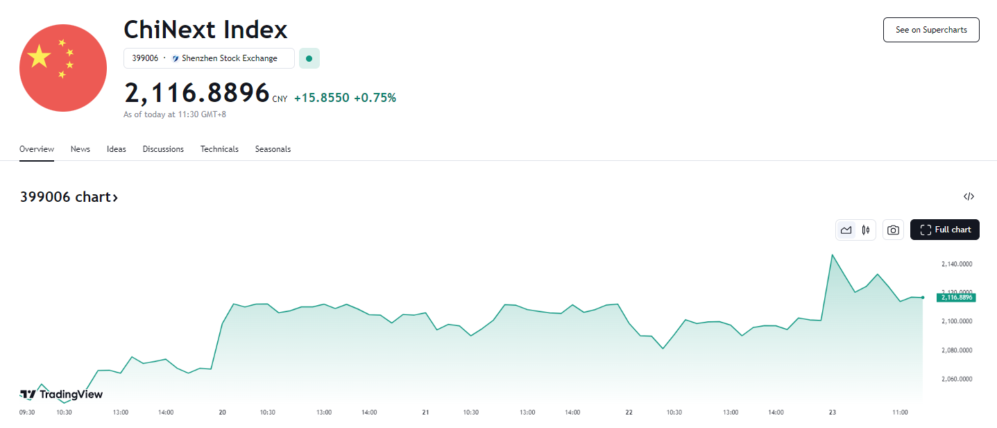 23日,A 股三大指数高开,创业板指盘中一度涨超 2%,目前稍有回落,上证指数涨 1.41%,深证成指涨 1.09%,创业板指涨 1.32%。