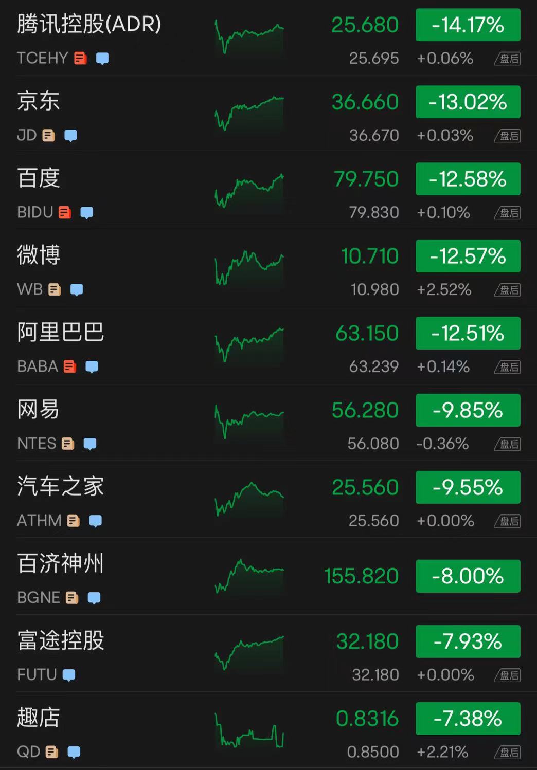 热门中概股集体大跌,拼多多、阿里巴巴、百度、京东、携程、哔哩哔哩跌幅超 10%,其中拼多多、阿里巴巴和京东盘中创历史最大跌幅。阿里巴巴大跌逾 12% 至 63.15 美元,跌破其 2014 年在美发行价 68 美元;京东股价收盘大跌 13.02%,盘中一度跌逾 22%;拼多多股价大跌 24.61%,盘中一度跌逾 35%。其他下跌的中概股包括: