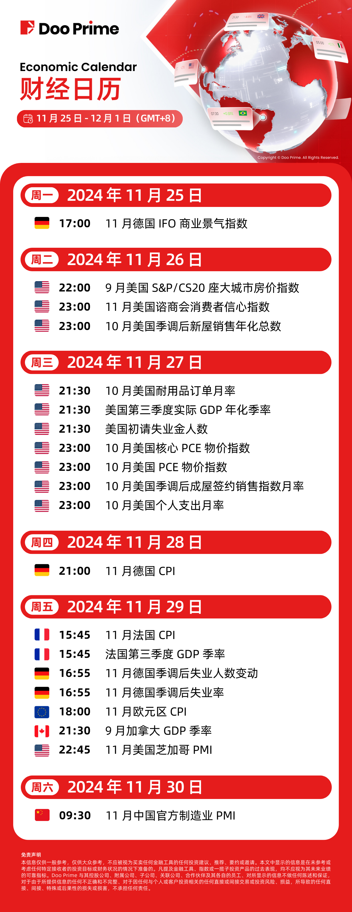 财经日历 | 以下为 2024/11/25 – 2024/12/1(GMT+8 北京时间) 全球重大经济事件提醒。在重大行情期间,请确保您已审查您的保证金率,并有足够的保证金来支撑您的风险敞口。
