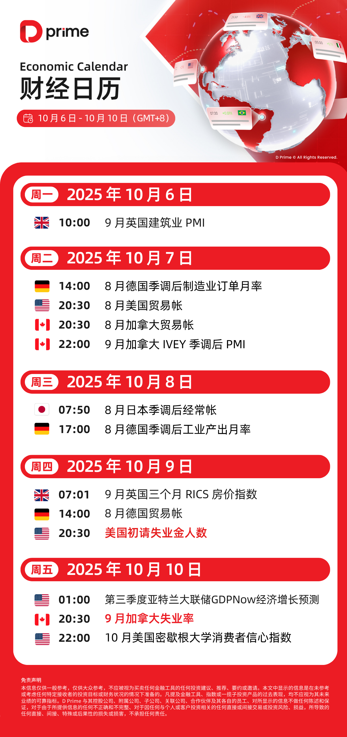 财经日历 | 以下为 2025 年 10 月 6 日至 2025 年 10 月 10 日(GMT+8 北京时间) 全球重大经济事件提醒。在重大行情期间,请确保您已审查您的保证金率,并有足够的保证金来支撑您的风险敞口。