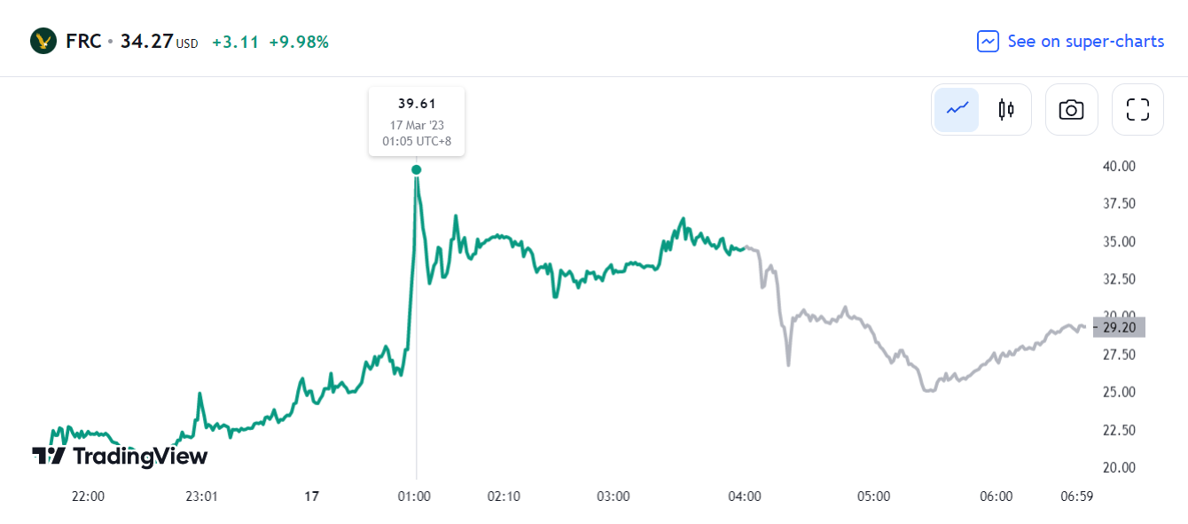 3 月 16 日,第一共和银行股价一度暴跌 36%,在美国大型银行出手救助的消息传出后,其股价短线拉升,收复全部失地,午盘一度飙升 28%。由于股价剧烈波动,第一共和银行周四多次停牌。第一共和银行当日收涨 9.98%,报 34.27 美元。
