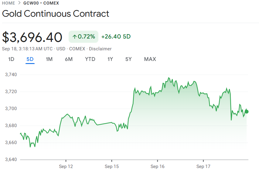 此前,国际现货金价在本周二一度触及 3,700 美元/盎司 的历史新高,受市场普遍预期美联储将在本周政策会议结束时,至少降息 25 个基点 带动。通常情况下,较低的利率会降低黄金的机会成本,同时削弱美元,从而提升黄金在 对冲通胀与避险资产 方面的吸引力。