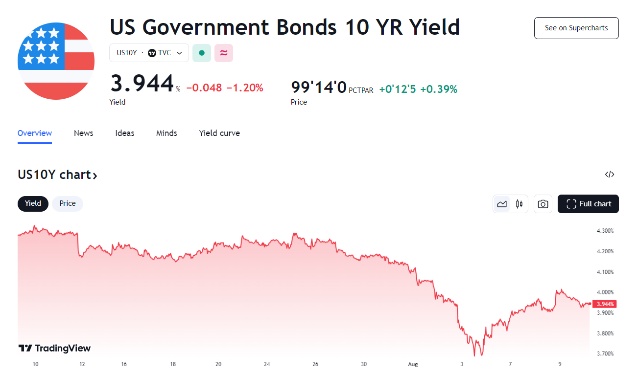 8月,美股开始下跌,很快,市场对债务安全性的需求急剧上升,资金涌入国债,导致上周初,10 年期国债收益率一度跌至自 2023 年中以来的最低水平。