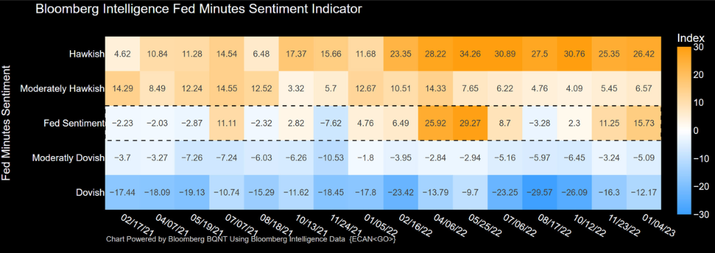 12 月会议纪要显示绝大多数美联储官员暗示加息速度将更慢,但利率最终将会更高。在推动货币政策朝着更加限制性的立场加息时,应当继续聚焦于经济数据,并保持“灵活性和选择性”。大多官员将终端利率预期水平上调至 5% 以上,但美联储主席鲍威尔的会后记者会表态为鸽派留了余地。