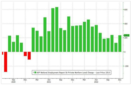ADP 报告公布 15 分钟后,美国劳工部的另一项数据显示,截至 2022 年 12 月 31 日当周,美国首次申领失业救济金的人数为 20.4 万人,为近四个月来的低位,和前一周修正后人数相比减少了 1.9 万人。这表明尽管科技行业以及房地产和金融等利率敏感行业出现了大量裁员,但初期仍保持在非常低的水平,可能需要美联储继续加息。