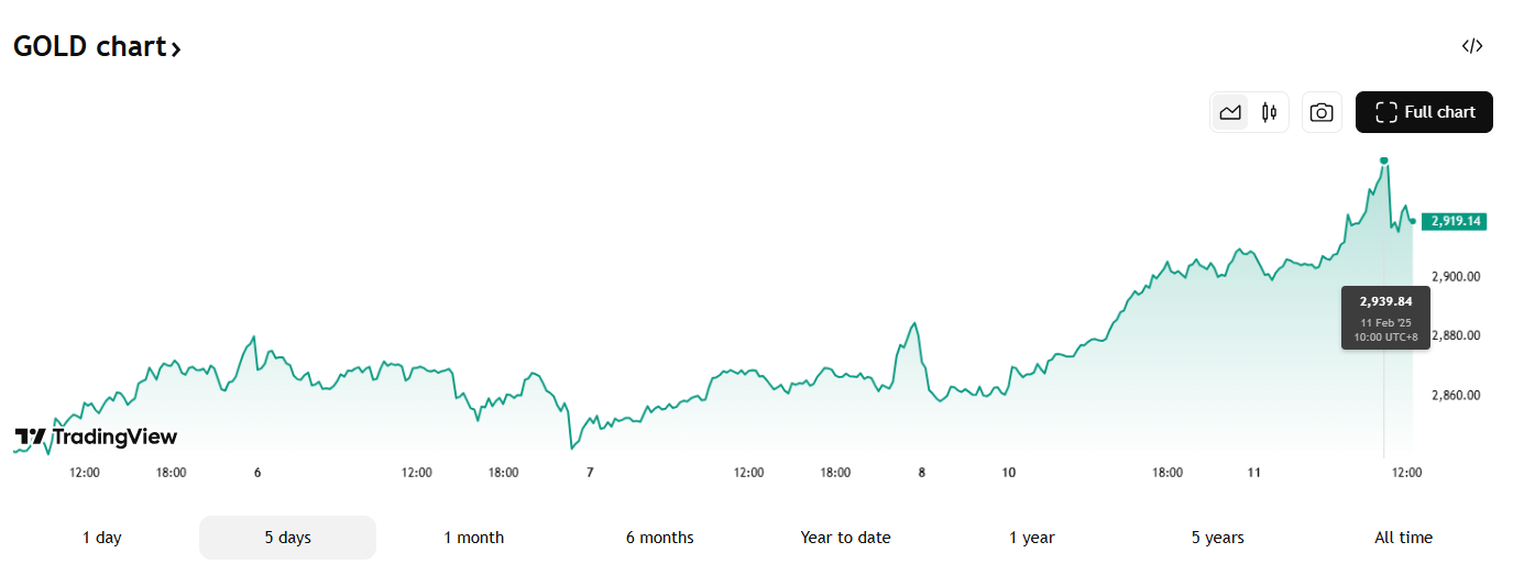 2 月 11 日截至发稿,现货黄金升破 2930 美元/盎司。