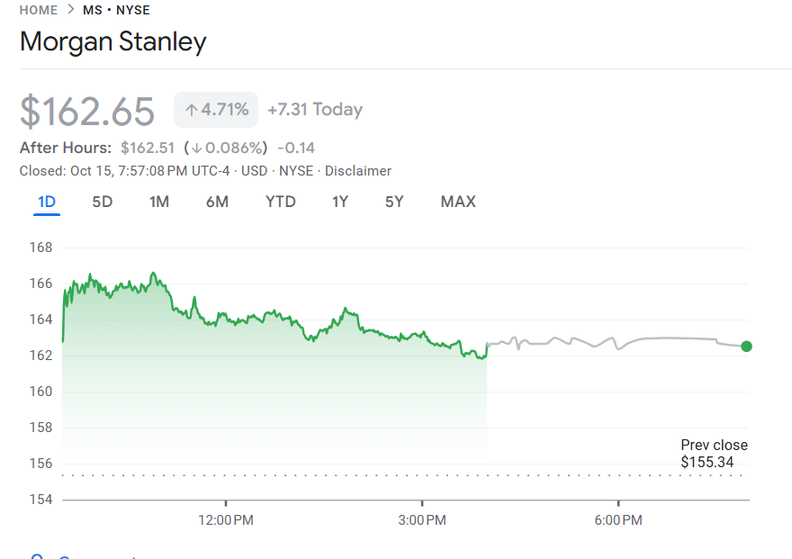 消息公布后,摩根士丹利(MS)股价在美股盘前上涨近 5%,收盘时报 162.31 美元,上涨 4.49%,年内涨幅已达 24%,表现显著优于金融板块整体。分析师认为,在并购活动复苏、市场交易活跃及财富管理扩张的支撑下,该行有望成为 2025 年华尔街表现最强的综合性金融机构之一。