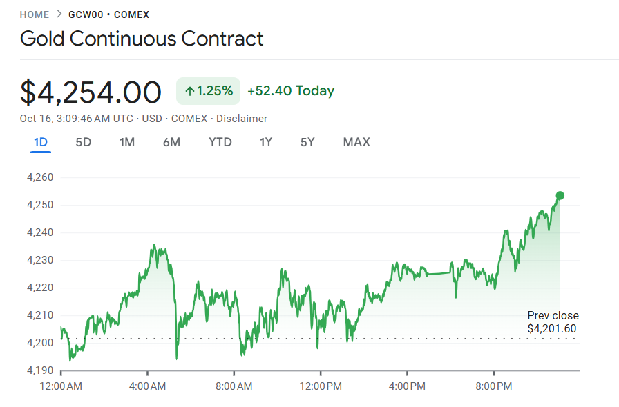 10 月 15 日至 16 日,受市场预期美联储即将降息及地缘政治紧张升温推动,投资者大举涌向避险资产,金价周三延续升势,首次突破每盎司 4200 美元关口。