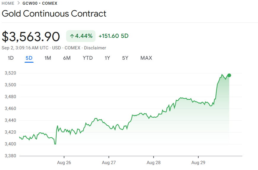 9 月 1 至 2 日,国际金价在经历 4 个多月区间震荡后再度走强。COMEX 黄金期货盘中最高触及 3,557.1 美元/盎司,刷新历史记录。