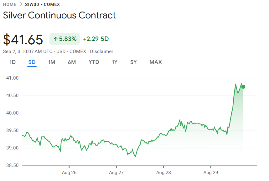 9 月 1 至 2 日,白银价格也迎来强劲上涨,COMEX 白银期货一度触及 41.64 美元/盎司,年内累计涨幅超过 40%。现货白银则突破 40 美元关口,创下自 2011 年以来的新高。