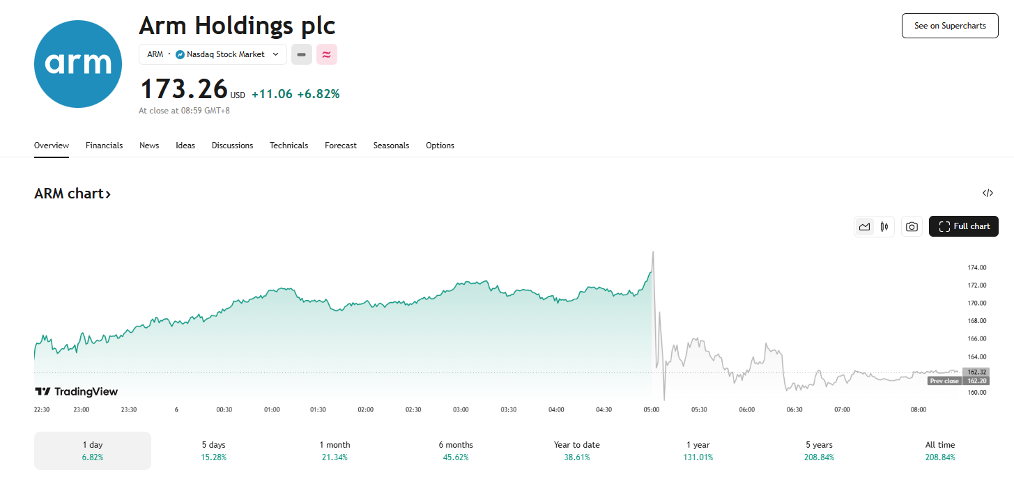 Arm 在业绩展望中表示,截至 3 月的 2025 财年第四季度总营收将在 11.8 亿美元至 12.8 亿美元之间。尽管这一预测较之前有所上调,并且与华尔街分析师们的平均预期基本一致,但部分分析师预计总营收可能高达 13.3 亿美元。对于市值高达 1800 亿美元且 2024 年以来乘着 AI 热潮股价暴涨 150% 的 Arm 来说,这份业绩指引无法令市场满意。