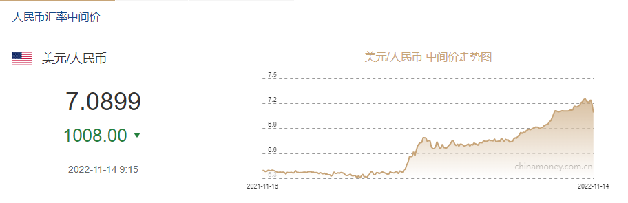 11月14日,人民币兑美元汇率延续涨势,中间价较上一交易日调升 1008 点至 7.0899,涨幅创 2005 年 7 月 22 日以来最大。上一交易日中间价为 7.1907,上一交易日官方收盘价 7.1106,上日夜盘报收 7.0935。随后,在中间价的带动下,人民币兑美元即期汇率开盘继续上周五的升值势头,一度升破 7.07 关口至 7.0652,升幅超过 300 点。
