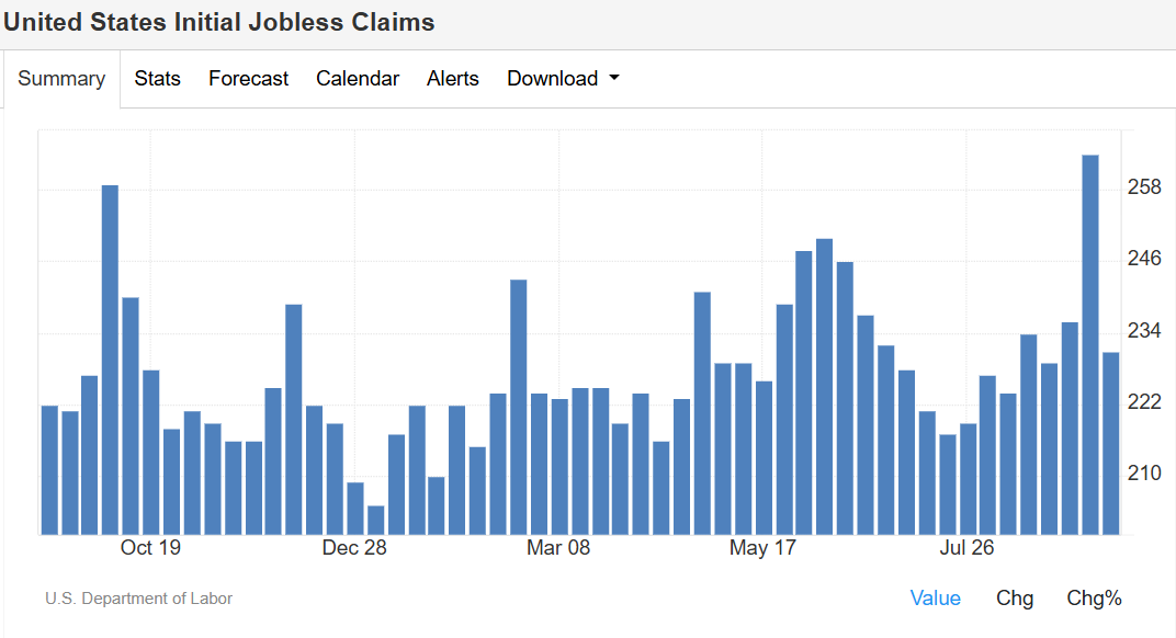美国劳工部数据显示,截至 9 月 13 日当周,首次申领失业救济人数骤降 3.3 万,至 23.1 万人,创下近四年来最大单周降幅,低于市场预期的 24 万人,逆转前一周的异常升势。