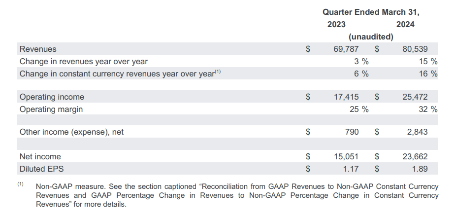 • 总营收 805.4 亿美元,同比增长 15%,创 2022 年初以来最快增速,并高于市场预期的 790.4 亿美元。