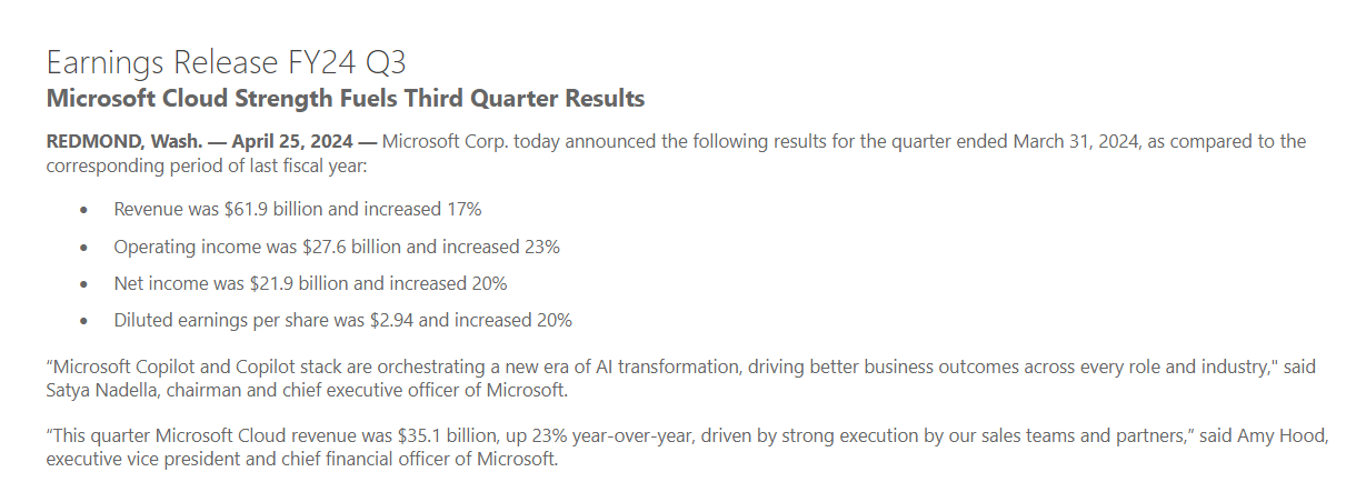 微软在 2024 自然年一季度财报显示,