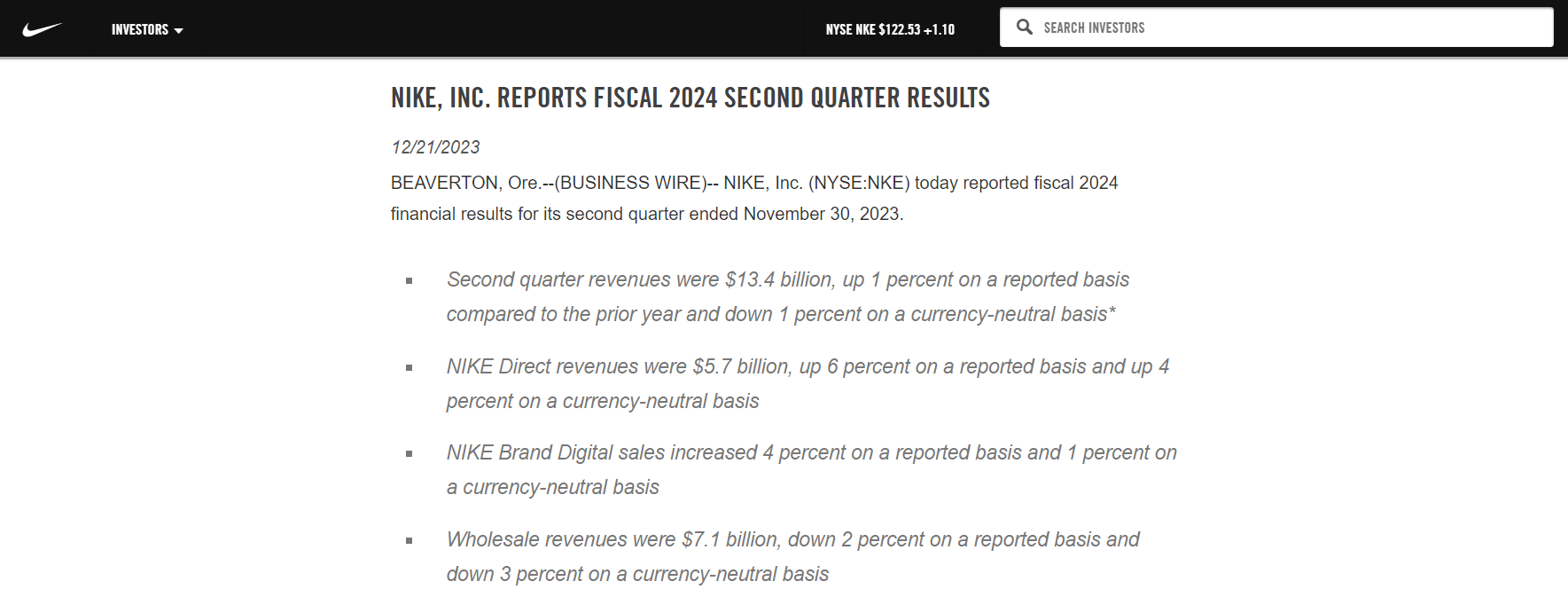 - 毛利率增长了 1.7 %,达到 44.6%,略高于预期的 44%;在过去的六个季度中,耐克的毛利率同比均有所下降,但第二财季的情况有所好转;