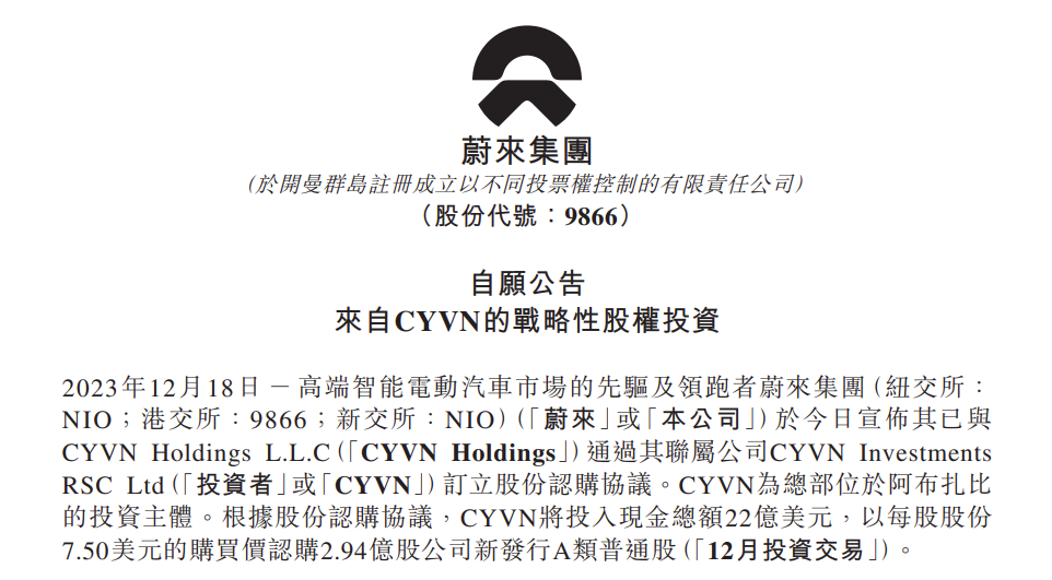 蔚来宣布拟向阿布扎比投资机构 CYVN Holdings 增发总价值约 22 亿美元股份,预计今年最后一周完成交易。交易完成后,CYVN 持有的蔚来流通股数量将由三季度末的 1.25 亿股增加至 4.19 亿股,持股比例升至 20.1%,成为蔚来最大单一股东。