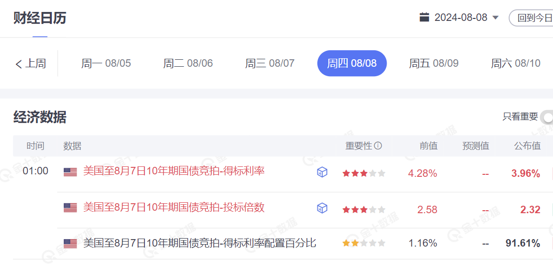 美国财政部拍卖 420 亿美元 10 年期国债,得标利率为 3.960%,虽然大幅低于 7 月 10 日的 4.276%,但出现了超过 3 个基点的尾部利差,表明需求疲软。