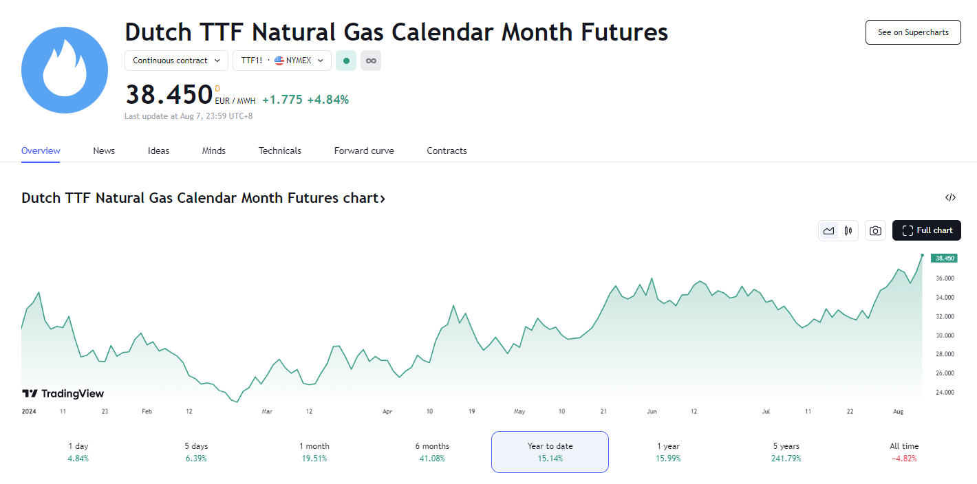 据悉,乌克兰军队占领了位于库尔斯克州 Sudzha 的一个关键天然气中转站,引发了供应中断的担忧。然而,分析师表示,天然气流量稳定,周三的气价上涨“可能夸大了对供应的威胁,因为通过这条路线的运输只能满足欧洲 3-5% 的需求,而且欧洲的库存也接近创纪录水平。