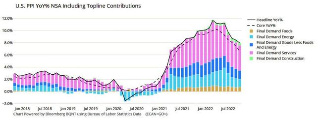 11 月 15 日,美国劳工部公布 10 月生产者价格指数( PPI )。早前公布的 10 月 CPI 超预期放缓,而 10 月的 PPI 增幅同样低于预期,服务成本两年来首次环比下降,两者均显示通胀可能触顶的迹象,被华尔街视为支持美联储尽早转向鸽派的信号。
