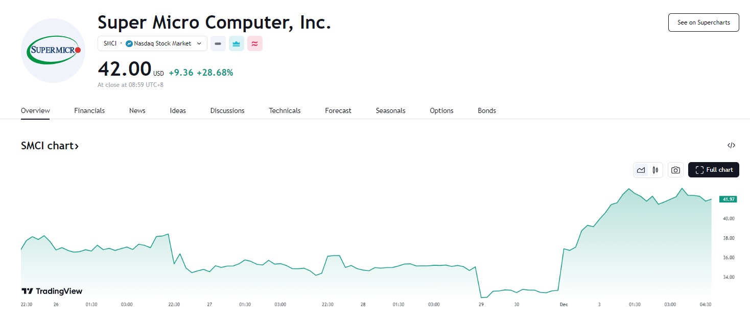 消息传出后,超微电脑美股盘前一度涨 13%,盘中涨幅扩大至超 30%,报 42 美元。