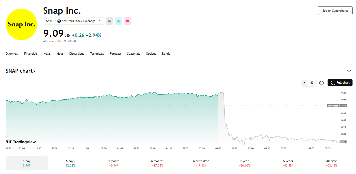 尽管社交网站 Snap 的一季度业绩超市场预期,但是 Snap 撤回二季度收入指引,还下调了全年调整后运营支出的目标,将此前 26.5 亿美元至 27 亿美元区间下调 5000 万美元,理由是关税政策引发的经济波动,冲击广告需求,导致 Snap 股价盘后一度重挫 16%。